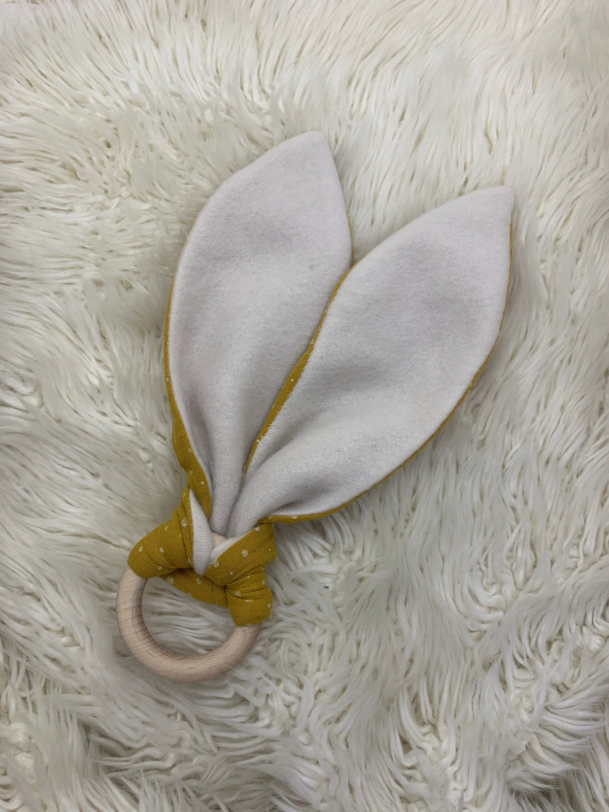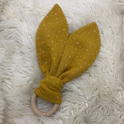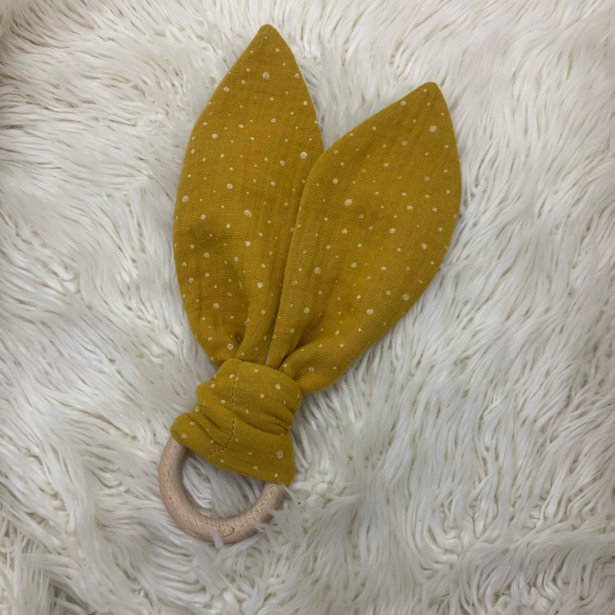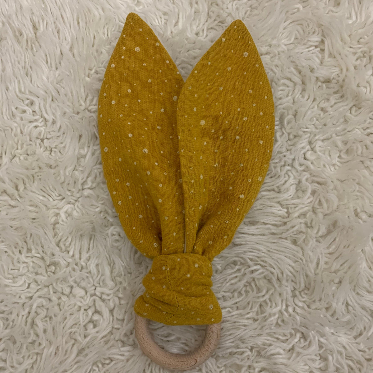 Beißring Hasenohren Greifling Zahnungsspielzeug Holzring gelb weiße Punkte Musselin