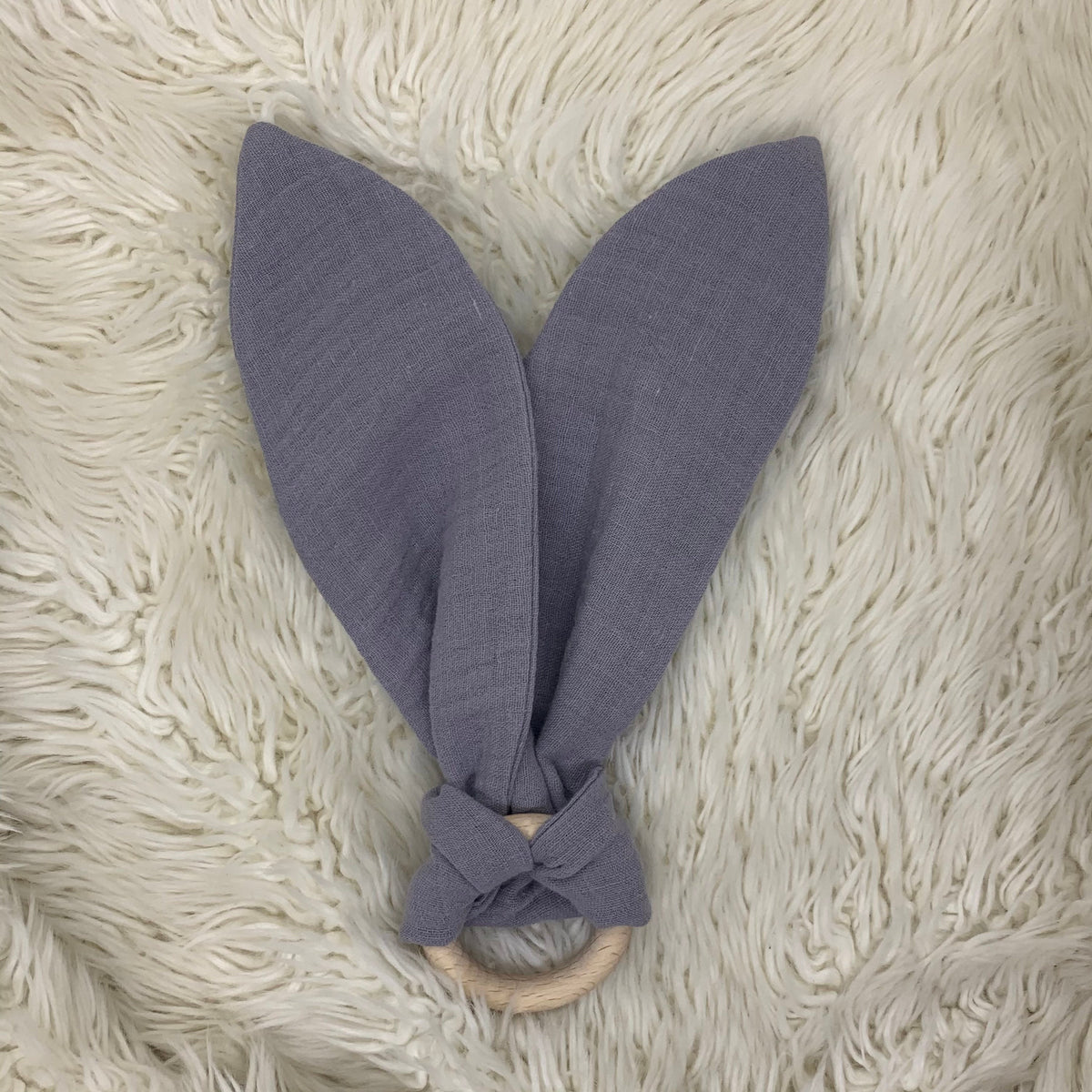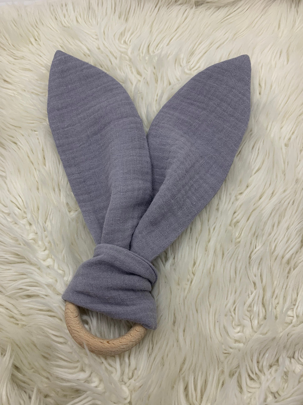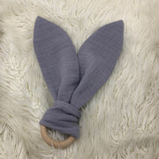 Beißring Hasenohren Greifling Zahnungsspielzeug Holzring hellgrau Uni Musselin