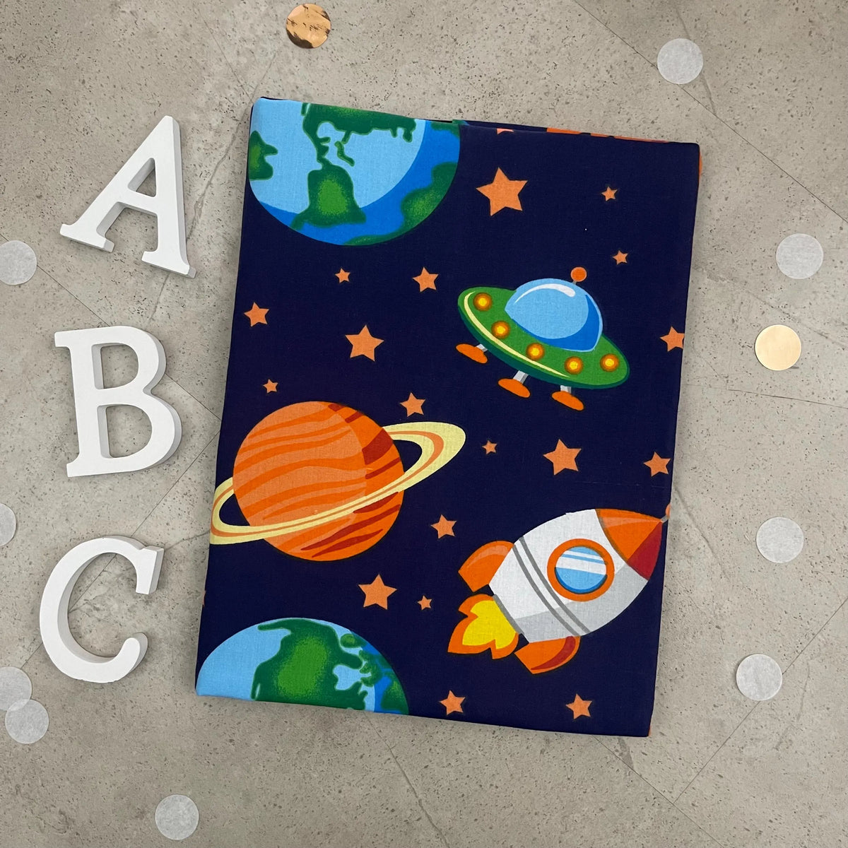 Handgefertigte Zeugnishülle aus Stoff – personalisiert & bestickt, perfektes Geschenk für Schüler - Weltraum Blau - ohne Namen