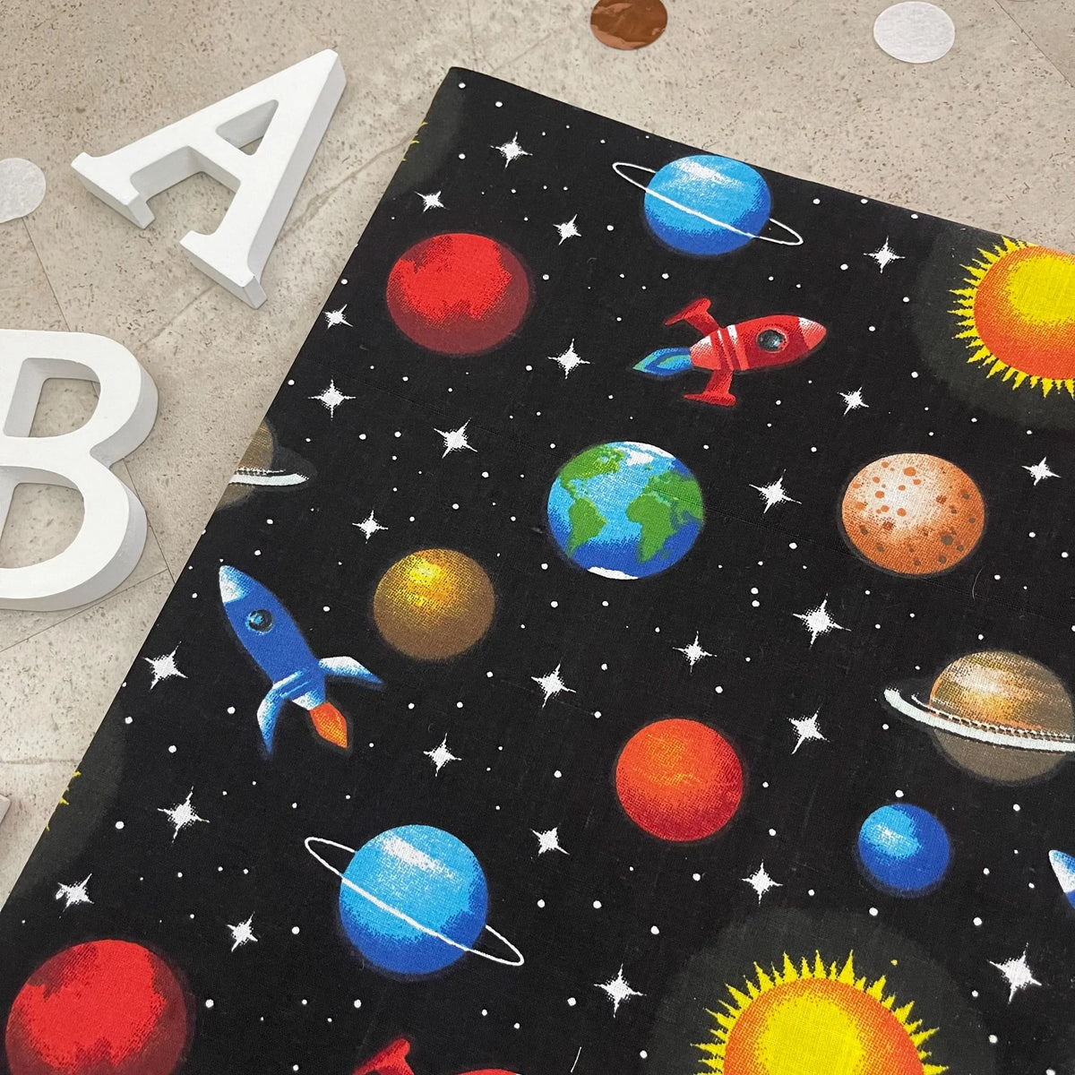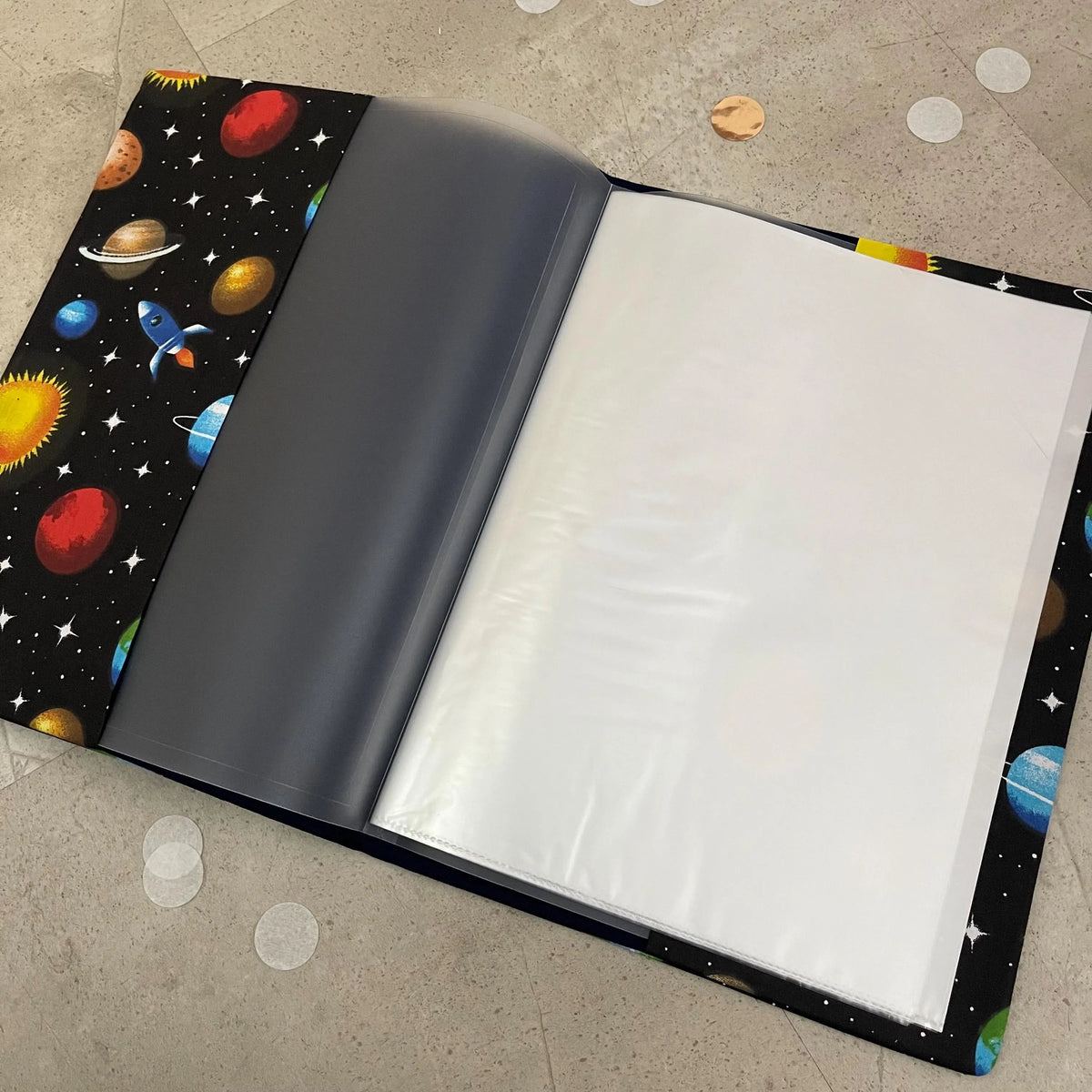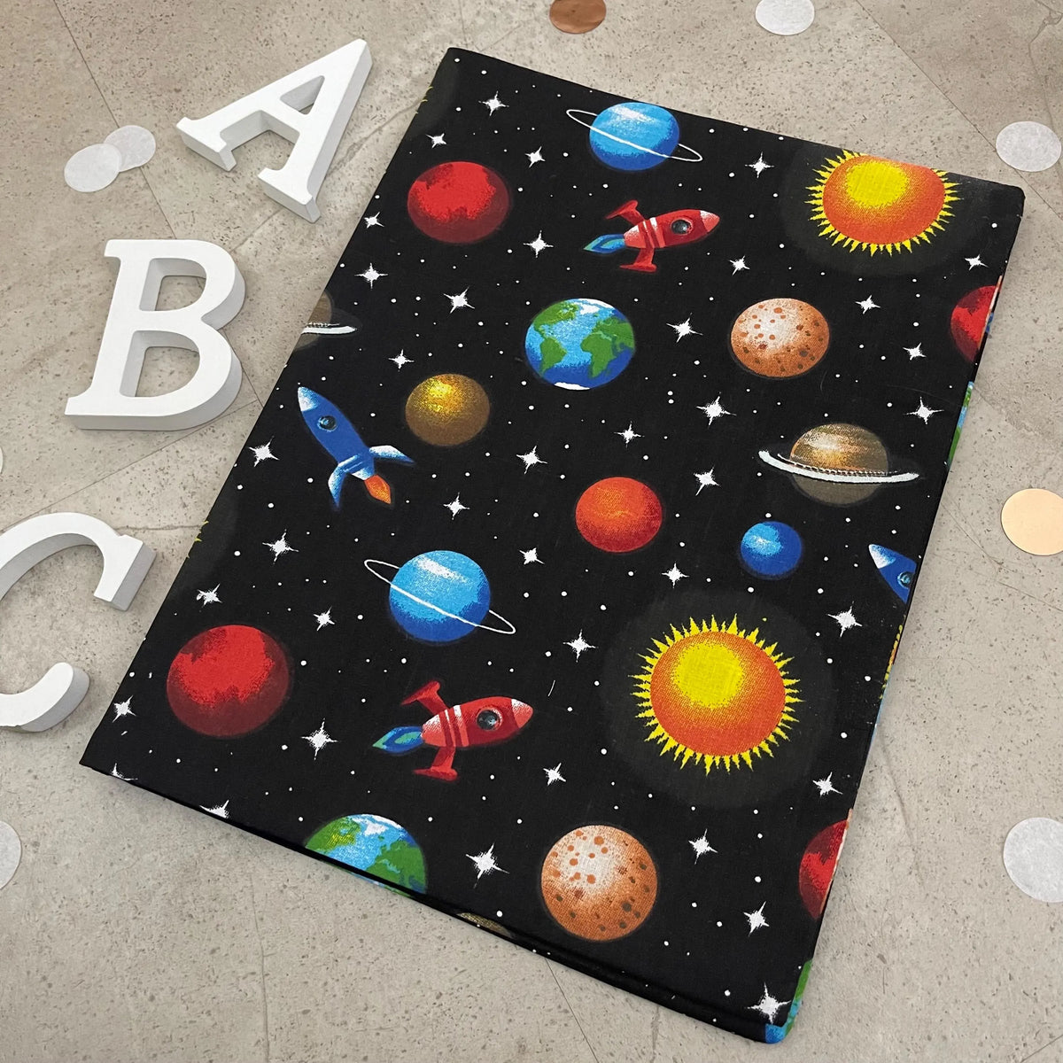 Handgefertigte Zeugnishülle aus Stoff – personalisiert & bestickt, perfektes Geschenk für Schüler - Weltraum Schwarz - ohne Namen